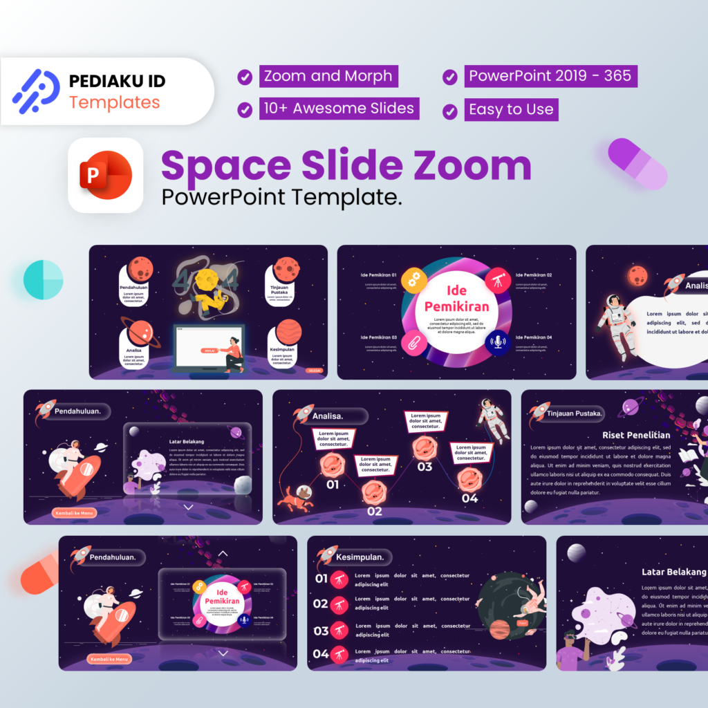 Template PowerPoint Pediaku ID Space Slide Zoom PowerPoint Rp 36.500 Untuk PPT: 2019 sampai dengan 365 File download template berupa file ZIP: (Guide Line, File PPT, Link Tutorial dan .xml Color Pallete) File otomatis akan dikirimkan ke email anda setelah sukses pembayaran Klik Video Produk untuk melihat Preview Template Metode Pembayaran: Check Out Template PowerPoint Lainnya
